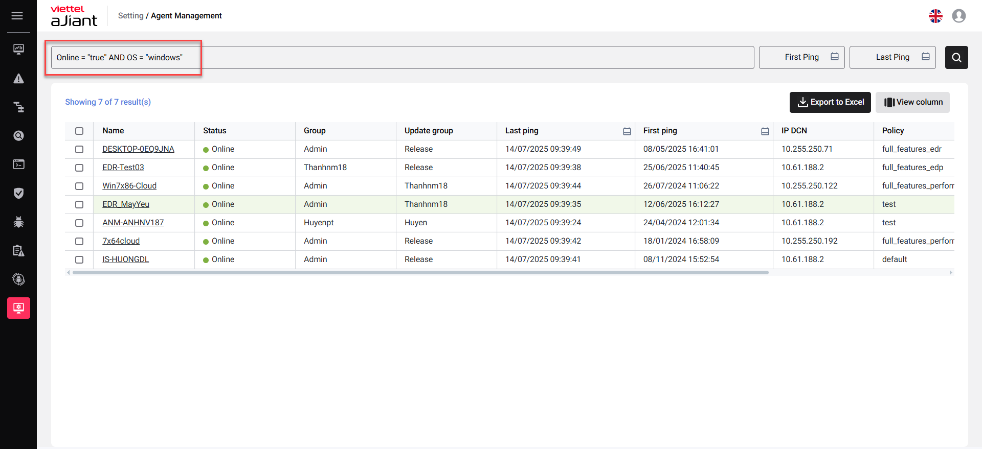- You can search for agents using various details such as Agent ID, Computer Name, Operating System, Architecture, Platform, Policy, IPDCN, Online Status, Update Group, Group ID, IP Address, MAC Address, and Version.