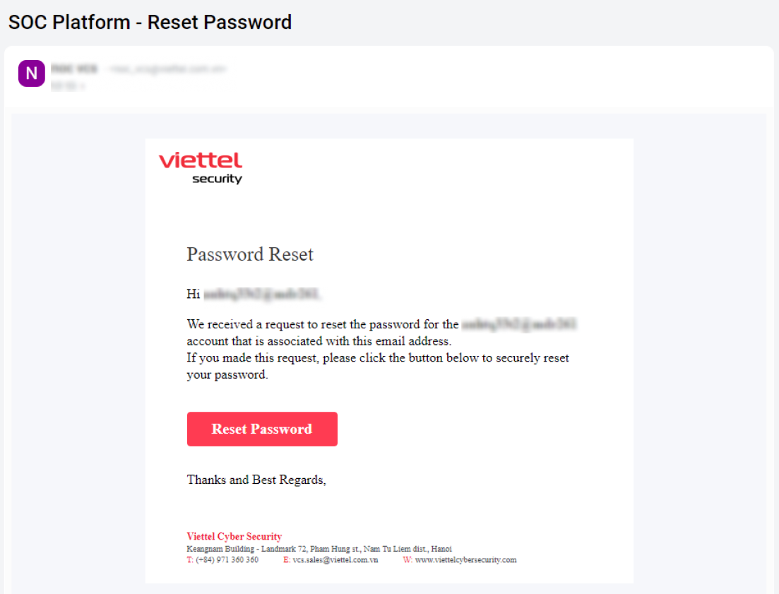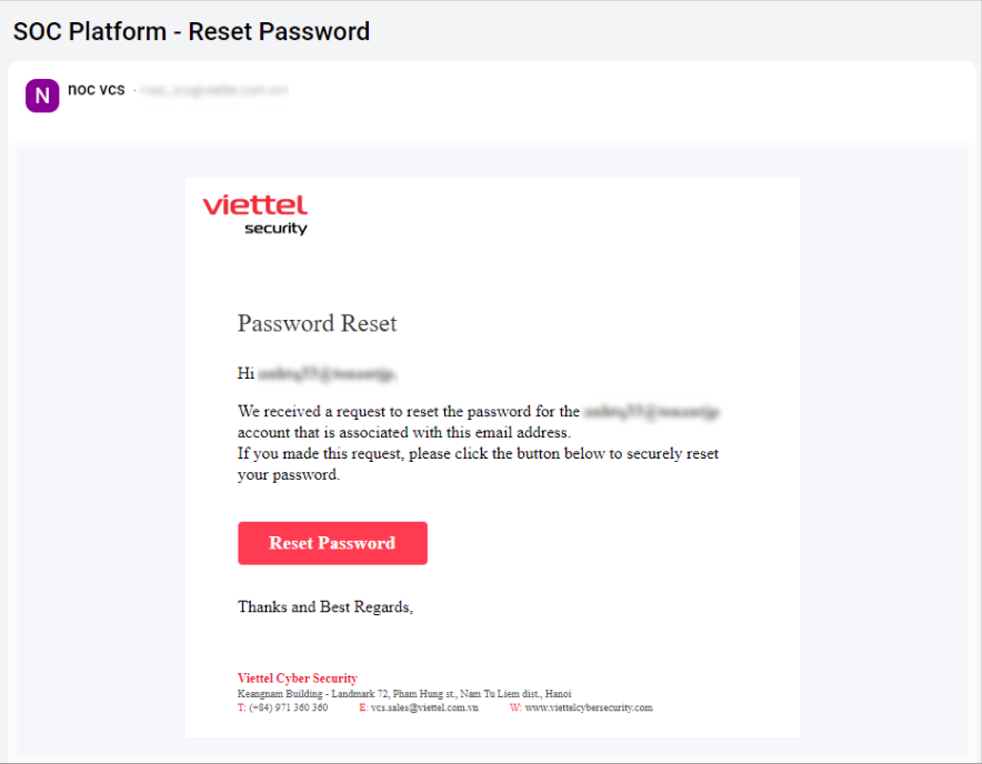 - Để giúp người dùng có thể nhận biết kịp thời nếu có hành vi đăng nhập trái phép vào tài khoản, hệ thống sẽ tự động gửi mail thông báo đến địa chỉ mail đã đăng ký của người dùng khi tài khoản được đăng nhập vào hệ thống SOC Platform từ một thiết bị mới.
