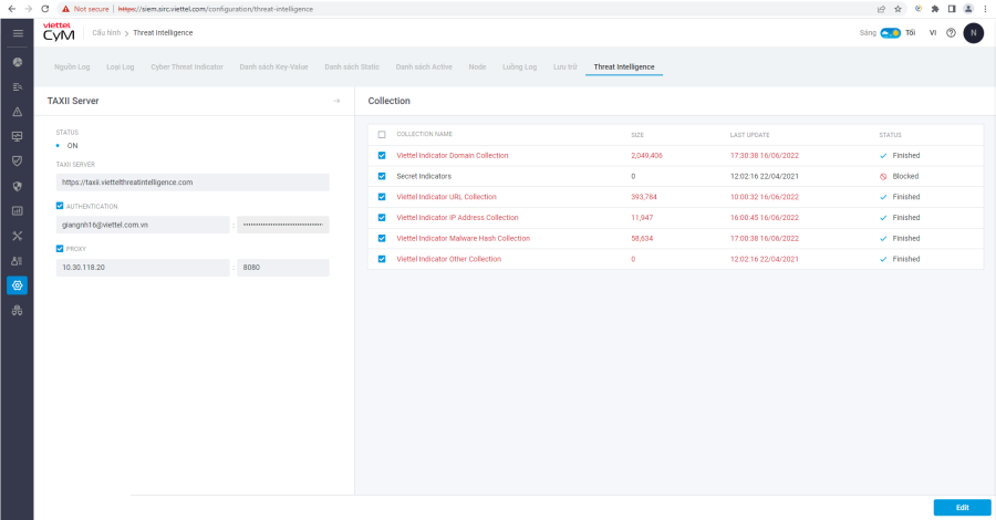 VCS-CyM Hướng dẫn sử dụng Cấu hình Current: Threat Intelligence Threat Intelligence Chức năng cung cấp khả năng tích hợp với hệ thống Threat Intelligence để thu thập thông tin về các domain, url, IP, malware độc, phục vụ cho nghiệp vụ phân tích tương quan sự kiện của hệ thống CyM ×